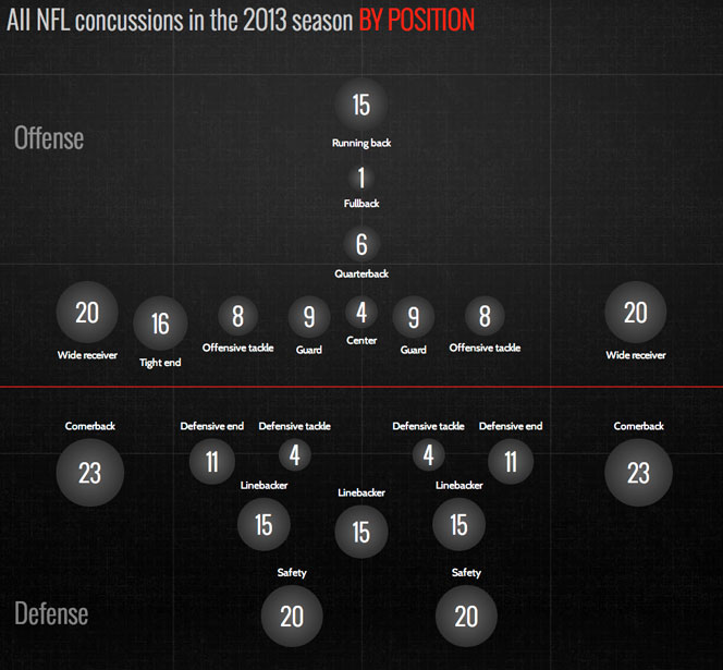 For current players, the findings carry added significance given that head injuries continue to be a routine part of the game. Consider a few findings from FRONTLINE’s Concussion Watch project, which since 2012, has been tracking every officially reported head injury in the NFL: