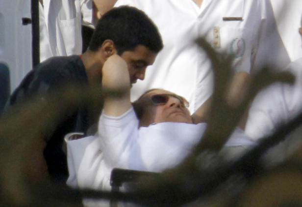 Egyptian medics escort former Egyptian President Hosni Mubarak, 85, into an ambulance after after he was flown by a helicopter ambulance to the Maadi Military Hospital from Torah prison in, Cairo, Egypt, Thursday, Aug. 22, 2013. (AP Photo/Amr Nabil)