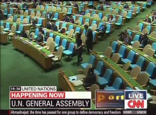 He says 4-5 people left the room before he spoke at the UN general assembly, and people like Pirouz say that what he says is "basically sound"! Simply compare the room when AN was speaking with when Obama was speaking to get an idea of how sound this guy is. His mind is not concerned with reality. As for the "average people of the world" and "public diplomacy", I urge Pirouz and Rezvan to take a look at the global public opinion polls that consistently rate AN as the most despised global politician among international public opinion.