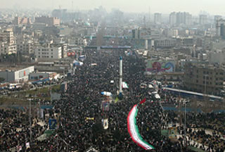 Hundreds of thousands of Iranians massed Thursday in central Tehran to mark the anniversary of the revolution that created the country's Islamic republic, while a heavy security force fanned out across the city and moved quickly to snuff out opposition counterprotests.