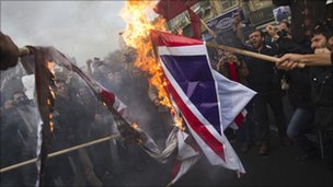 "Protest by a few Basiji students...Burnt the Union Jack but at least got it the right way up this time," Gass tweeted on Monday.