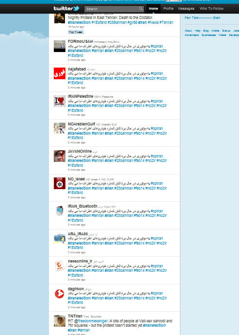Pro-regime Twitter accounts have intensified their activity on February 20 (Esfand 1 in Iranian calendar), a day of protests called by the opposition. The following screen capture shows some of the culprits tweeting the same messages at the same time. Some of the messages aim to create fear ('Motorcyclists are jotting down our car registration number...) and spread disinformation ('URGENT/ Mousavi arrested + photo'). Others are incitements to violence ('Esfand 1 - a day to demand blood')...