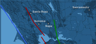 Along with the Greenville and Mt. Diablo faults, an earthquake along the Concord-Green Valley Fault line would mostly affect the Sacramento-San Joaquin areas. The fault lies 10 miles east of Napa. Damage from the creep of the fault can be seen in the sidewalks and streets of downtown Concord, Calif. No major earthquakes have been recorded on the fault. |