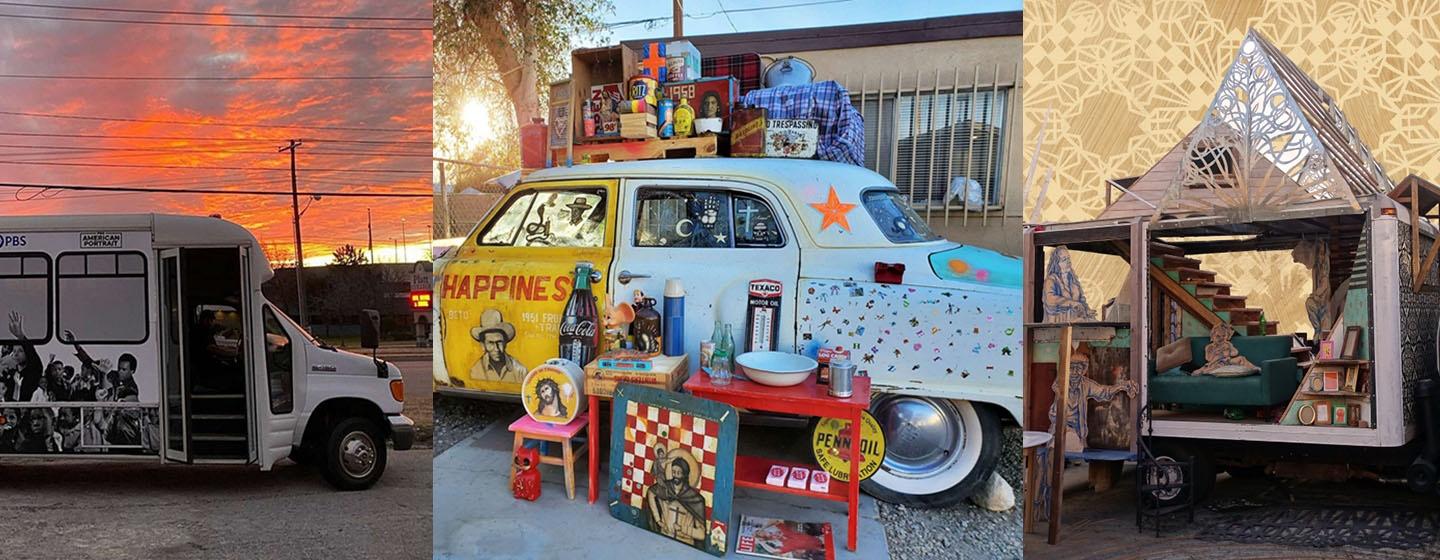 Housed and displayed on vehicles, the art similarly references American stories in motion, from nomadic migrant laborers in search of better lives and the long journey towards racial justice to the hustle and bustle of everyday life inside our own homes. The outdoor format is also constructed with safety and social distancing considerations to engage audiences during the pandemic, bringing the artwork directly to the three communities.