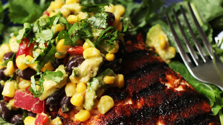 Normally I love to season salmon with just a little bit of salt and pepper, but occasionally I will season it with a homemade rub. Making a rub is a great alternative to marinating salmon. Taking only a few minutes to mix together, rubs do not require any additional soaking time before grilling like marinades do. Just a quick rub of the spices and the salmon can go straight to the grill. The end result is a very moist and flavorful salmon fillet. Not bad for a couple of minutes of work. You could stop there, or for a few more minutes of work and no additional cooking, you can make this quick and easy corn salsa to compliment the salmon. All you need to do is some light chopping and mixing. Together this winning combination of seasoned salmon topped and corn salsa is healthy, light, and a breeze to make. So here's to less time inside and more fun time outside. Enjoy!