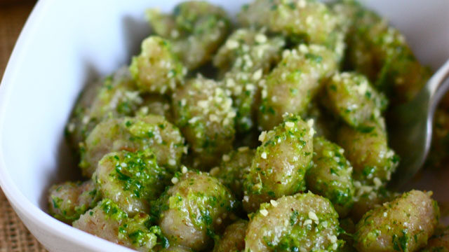 Substitute arugula for basil to make a simply delicious pesto recipe to top on your gnocchi for a healthy dinner.