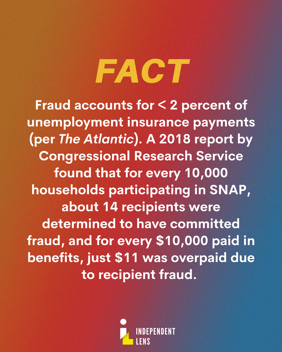 FACT: For every 10,000 households participating in the Supplemental Nutrition Assistance Program (SNAP), about 14 contained a recipient who was investigated and determined to have committed fraud (via a 2018 report by the Congressional Research Service). Within SNAP, for every $10,000 paid in benefits, about $11 is determined by state agencies to have been overpaid due to recipient fraud.
