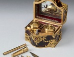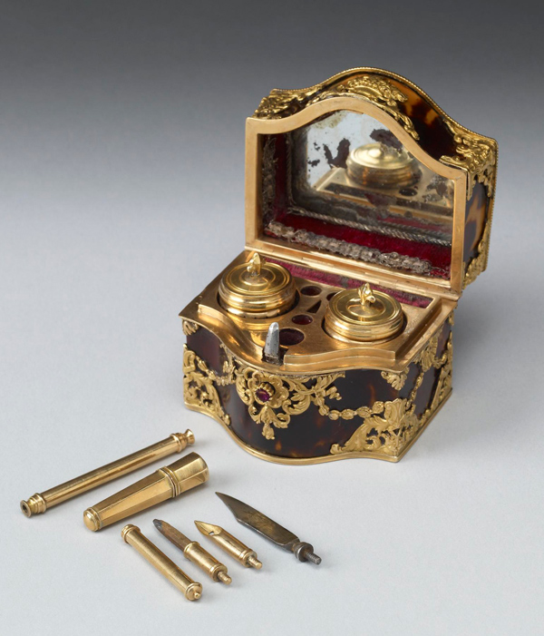 Turkish Penholder and Reed Pen (18th century), gilt metal set with rubies (or spinels) and emeralds. Courtesy the Walters Art Museum. Until relatively recently, reading and writing were the pastimes of the privileged elite (or religiously employed), and the tools of literacy were symbols of power, wealth and worldliness. Now at the Walters Art Museum in Baltimore, an exhibit called “Art of the Writing Instrument from Paris to Persia” looks at the pretty pens and other tools that stood as status symbols for their owners or helped turn the act of writing into a gracious art. Art Beat talked to Amy Landau, associate curator for Islamic Art and Manuscripts, about the Walters’ collection of luxurious writing implements and how today’s digital writing tools stack up: What was the inspiration for this exhibit? The impetus for “Art of the Writing Instrument from Paris to Persia” was to highlight a theme related to writing, as this show is staged in our gallery dedicated to manuscripts and rare books. There was also the desire to draw upon the Walters’ outstanding collections of Asian, Middle Eastern and European art. Ingenious design, precious materials and the social significance of the writing implements draw together diverse cultures across this geographical spread. How did the writing implement itself become a luxury item or a work of art? This exhibition concentrates on writing instruments from the 17th to the 19th century. These objects were emblems of education, refinement and political power, and they have been collected, gifted, worn or depicted alongside their owners for centuries. They were often fashioned from costly and exotic materials, including mother-of-pearl, lacquer, tortoiseshell, gold and silver. Such writing implements, like other luxury objects, were associated with high social status. Amy Landau describes some of the objects in “Art of the Writing Instrument.” Click to enlarge. Do all of the items come from your museum’s collection? All the exhibited works were drawn from the Walters collection. In fact, the majority of objects on view were in storage. In the present economic situation, museums are concentrating on defining innovative shows based on their own holdings for their audiences. The Walters staff is particularly good at this. We also have the advantage of working with a truly exceptional collection that is encyclopedic in nature. Is there any modern day equivalent to the exquisite items in the exhibit? Are our iPads and laptops the natural progression? Just like our iPads and iPhones, many of the objects on view were constructed with a view to delighting the user, either through the level of comfort in the hand or by technological innovation. Regarding design and technology, perhaps our smart phones and laptops used for means of communication like texting and emailing are a natural progression. However, our modern day tools emphasize speed in communication; whereas many of the historic objects on view underscore contemplation and enjoyment of the act and processes of writing. Let’s face it, no one wants to write a poem, love letter or diplomatic correspondence on the keyboard of a smart phone! Texting, email and social networking with their abbreviated forms, such as emoticons, have taken the place of thoughtful letter writing for many. The personal nature of one’s handwriting has surely been lost with our [technology] and laptops. Although this might return as we increase our technical sophistication to somehow reproduce expressions of individuality such as handwriting, calligraphy and variously colored inks beyond picking from a scroll down menu of fonts and colors. In the show, we have a comment book for our visitors to write their thoughts about the ways human communication has evolved over time and to reflect on the value of the written word and letter writing in communication today. So I’ll end here with a few visitor comments: “Last Christmas, I wrote a letter to friends who were far away. Sending and receiving hand written letters made me realize how precious human relationships are [….]” “The way we will be remembered is by what we leave behind. You can’t leave behind a text because Sprint will cut off your phone and all your texts and emails– write a letter because Sprint can’t take that away!” “I wish people still wrote love letters. Now that would be an amazing gift to get.” A free press is a cornerstone of a healthy democracy. Support trusted journalism and civil dialogue. Donate now