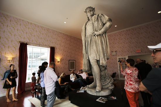 Click to enlarge. Photo by Spencer Platt/Getty Images. A 13-foot statue of Christopher Columbus stands in a 810-square-foot living room in New York City. The art installation, called “Discovering Columbus,” is by Japanese artist Tatzu Nishi. About the exhibition, from the Public Art Fund: “The marble statue, which rises to more than 75 feet atop a granite column, was designed by the Italian sculptor Gaetano Russo. It was unveiled in 1892 to commemorate the 400th anniversary of Columbus’s first voyage to the Americas. Despite its prominent public location, the statue itself is little known, visible only as a silhouette against the sky or at a distance from surrounding buildings. “Nishi’s project re-imagines the colossal 13-foot-tall statue of Columbus standing in a fully furnished, modern living room. Featuring tables, chairs, couch, rug, and flat-screen television, the decor reflects the artist’s interpretation of contemporary New York style. He even designed wallpaper inspired by memories of American popular culture, having watched Hollywood movies and television as a child in Japan. Discovering Columbus offers both a unique perspective on a historical monument and a surreal experience of the sculpture in a new context. Allowing us to take a journey up six flights of stairs to a fictional living room, Tatzu Nishi invites us to discover for ourselves where the imagination may lead.” “Discovering Columbus” is on view through Nov. 18. A free press is a cornerstone of a healthy democracy. Support trusted journalism and civil dialogue. Donate now