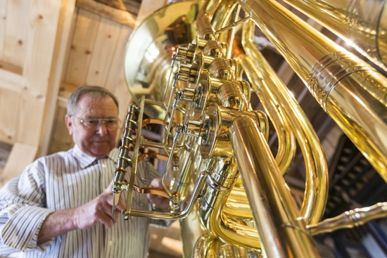 Click to enlarge. Craftsman Manfred Paulus adjusts the valves of world’s largest functional tuba — exactly double the dimensions of a normal tuba — at the Musikinstrumenten-Museum in Markneukirchen, Germany. Twenty local artisans helped craft this mega instrument in 2010 as part of celebrations around the 650th anniversary of Markneukirchen, a town with a rich tradition of brass and wood musical instrument manufacturing dating back to the 17th century. Photo by Joern Haufe/ Getty Images. A free press is a cornerstone of a healthy democracy. Support trusted journalism and civil dialogue. Donate now