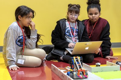 The robots we use from VEX Robotics have the directions on them, which makes this activity much easier for students. Younger students may struggle a bit if they don’t know their left from their right. Timelines for learning robotics are very individualized to the student and can be differentiated easily. Some students learn how to code with touch within a week and can move on, while others may take longer. Robotics instruction can be presented to the whole group, small groups or individuals, and is a great center activity as well.