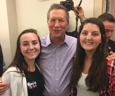 New Hampshire high school student Allison Perkins and a friend pose with Republican candidate John Kasich.