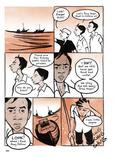 At one point, the refugee boat encounters several other ships that suspiciously start following them. Bo fears that they might be pirates, so he quickly navigates the boat away. When one crewmember remarks, “Oh god, if they catch us…”, Bo exclaims angrily, “I’ve heard the stories! Don’t you think I want to protect my wife and family as much as you do yours?!" (243)