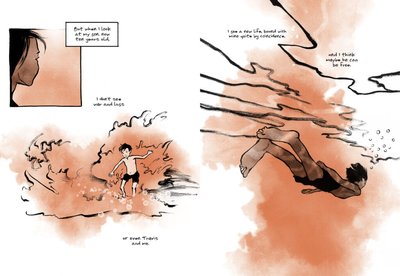 In the illustration, Bo looks at the other man with a pained expression, his brow furrowed and hand clutching the boat paddle. This moment almost moved me to tears; I felt in awe of Bo’s self-sacrifice and his deepest motive for survival: to protect his family.
