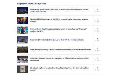 For Wednesday, Feb. 2, 2002: The U.S. approaches 900,000 COVID deaths with a mortality rate far higher than other wealthy nations, as the vaccination campaign stagnates. Then, a former NFL head coach sues the league for racial discrimination after being fired by the Miami Dolphins, and scientists uncover rampant COVID infections in white-tailed deer, raising questions about the pandemic's future.