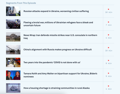To watch the feature story, click the video above, or skim the segments from the latest NewsHour, and choose the story that works best for your class. Then answer the questions below. Click on the following images which will take you to the video. NOTE: Some segments from this broadcast contain disturbing images of war. Please review all material before sharing with your classroom.