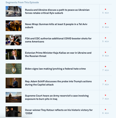 Tuesday on the NewsHour, Russia and Ukraine discuss a potential path to peace as Ukrainian forces retake a critical Kyiv suburb. Then, an anti-lynching bill bearing the name of slain teen Emmett Till is signed into law by the president nearly 70 years after his murder. Also, Rep. Adam Schiff talks about the probe into former President Trump as the committee on the Capitol attack gathers evidence. Directions :- To watch the feature story, click the video above and read this summary: President Biden on Monday stood by his comments over the weekend that Russia's Vladimir Putin "cannot remain in power" as Ukraine President Zelensky said he was open to discussing neutrality for his nation in exchange for a ceasefire. Special correspondent Ryan Chilcote talked with President Vladimir Putin's chief spokesman and deputy chief of staff Dmitry Peskov to get a view inside the Kremlin.