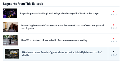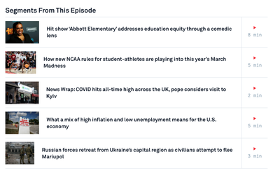Ukraine says its forces have retaken the entire region around the capital Kyiv as President Volodymyr Zelenskyy warned that retreating Russian forces left behind "a complete disaster" and said residents should beware of continued shelling and land mines. Meanwhile, efforts to get civilians out of the hard-hit city of Mariupol pressed on. NOTE: This piece contains some disturbing images of war. Please review all material before sharing with your classroom. Directions : To watch the feature story, click the video above. Or skim the segments from the latest NewsHour by clicking on the image below, and choose the story that works best for your class. Then answer the questions below.