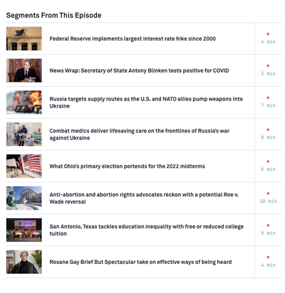 The Federal Reserve raised interest rates again Wednesday in an effort to stamp down surging inflation. It increased rates by a half-percentage point, a move that will affect the pocketbooks of millions of Americans. Fed Chair Jerome Powell said more hikes are planned for this year. The Fed has changed course considerably while trying to avoid triggering a recession. Paul Solman reports. Directions : To watch the feature story, click the video above. Or skim the segments from the latest NewsHour by clicking on the image below, and choose the story that works best for your class. Then answer the questions below.