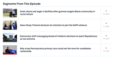 In Buffalo, N.Y., vigils and prayers services were held across the city Sunday after a gunman killed 10 people and wounded three others in a racially motivated shooting rampage at a busy supermarket in a Black neighborhood. Kathleen Belew, author of "Bring the War Home: The White Power Movement and Paramilitary America," joins Geoff Bennett to discuss the role of extremism in the shooting. Directions : To watch the feature story, click the video above. Or skim the segments from the latest NewsHour by clicking on the image below, and choose the story that works best for your class. Then answer the questions below.