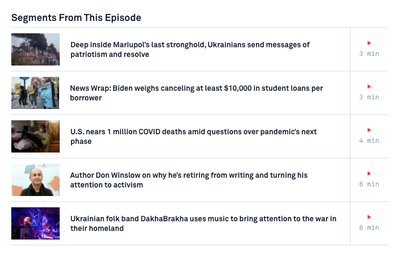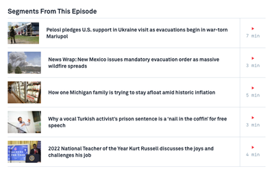 About 100 residents in Ukraine's port city of Mariupol on Sunday were freed and promised safe passage after being trapped for months in the basement of a steel plant with little access to clean air, food or water. This comes after House Speaker Nancy Pelosi led a U.S. delegation to meet with Ukrainian President Zelenskyy. Nick Schifrin reports from Lviv. Directions : To watch the feature story, click the video above. Or skim the segments from the latest NewsHour by clicking on the image below, and choose the story that works best for your class. Then answer the questions below.