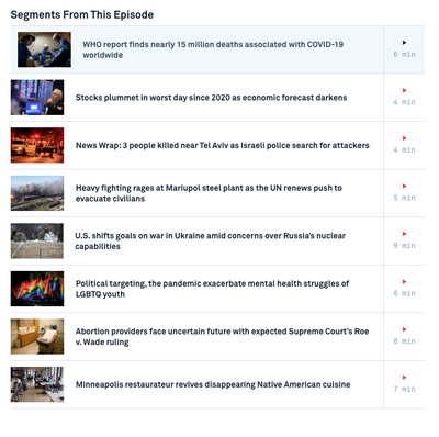Nearly 15 million people around the world have died from COVID's impact, directly or indirectly, during the first two years of the pandemic, according to a new World Health Organization report. It’s also about three times higher than governments have reported so far. University of Washington's Jonathan Wakefield, whose modeling work helped produce the report, joins William Brangham for more. Directions : To watch the feature story, click the video above. Or skim the segments from the latest NewsHour by clicking on the image below, and choose the story that works best for your class. Then answer the questions below.