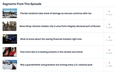 In the wake of Hurricane Ian, at least 34 people have been confirmed dead — including 27 in Florida — a number that is expected to increase. As damage estimates grow, Ian may become one of the costliest storms in U.S. history. For a transcript of the lead story, click here . You may also choose another story from the newscast by clicking the link below and answering the following questions:
