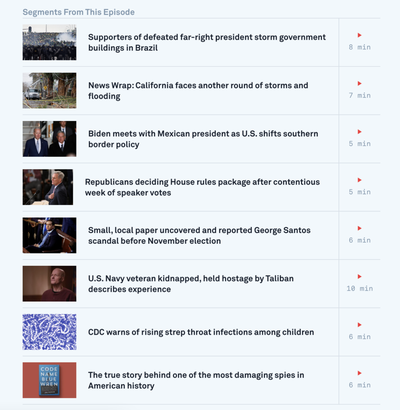 What students can do : 1. You may have seen another recent story about Rep. Santos, in which he is accused of giving a white power symbol (he has not answered questions about the allegation) on the floor of the House of Representatives. Learn more about the story here by reading this article from the fact-checking site, Snopes. 2. Get informed! Knowledge really is power. Check out the latest broadcast of the NewsHour including mass arrests in Brazil after thousands stormed government buildings in support of the defeated far-right president; President Biden's meeting with his counterpart in Mexico City as the U.S. announces a strategy shift at the southern border — plus, Navy veteran Mark Frerichs on being held hostage by the Taliban in his first interview since his release.