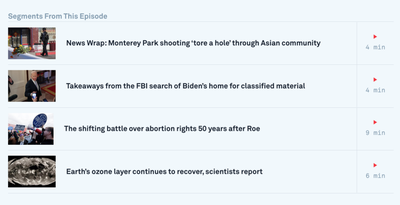 What students can do : Check out the latest segments from the NewsHour, and choose the story you're most interested in watching! You can start by reading the summary here : In the latest broadcast of the NewsHour, the latest on a mass shooting in Monterey Park, California during Lunar New Year celebrations. Then, the fallout for President Biden after an FBI search uncovered more classified materials at his Delaware home. Also a look at the state of abortion rights on the 50th anniversary of Roe v. Wade.