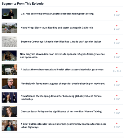 What students can do : Check out the latest segments from the NewsHour, and choose the story you're most interested in watching! You can start by reading the summary here : In the latest broadcast of the NewsHour, the U.S. hits its borrowing limit, forcing the Treasury to take measures to avoid default while Congress wrangles over raising the debt ceiling. A new program allows American citizens to sponsor people fleeing violence and oppression. Plus, scientists lay out the environmental and health effects associated with gas stoves as they become the subject of national debate. You can make a Google doc copy of our Five Facts and discussion questions that work for any of these stories here .