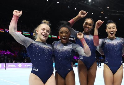 Gymnastics - 2023 World Artistic Gymnastics Championships - Sportpaleis, Antwerp, Belgium - October 4, 2023 Gold medallist Simone Biles of the U.S. and teammates celebrate winning the women's team final REUTERS/Yves Herman