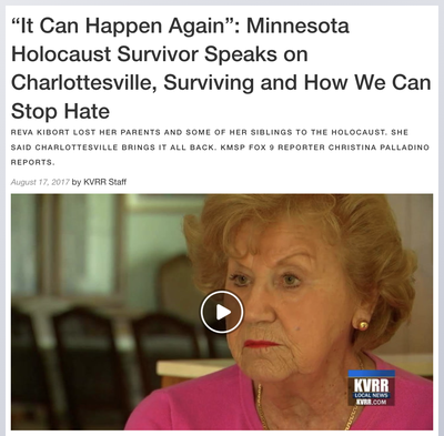 - Watch “It Can Happen Again”: Minnesota Holocaust Survivor Speaks on Charlottesville, Surviving and How We Can Stop Hate with Reva Kibort via KVRR News (Aug. 17, 2017).