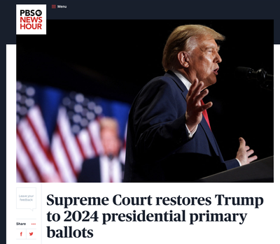 March 4, 2024: "WASHINGTON (AP) — The Supreme Court on Monday restored Donald Trump to 2024 presidential primary ballots, rejecting state attempts to hold the Republican former president accountable for the Capitol riot.