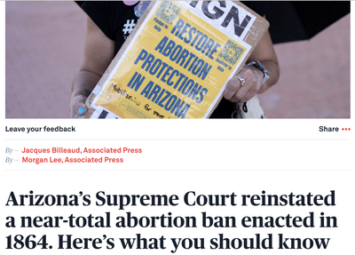 What students can do: Learn about some of the laws surrounding the issue of abortion in America, including the Comstock Act ("Originally passed in 1873 and named for an anti-vice crusader, the Comstock Act was intended to prohibit the mailing of contraceptives, “lewd” writings and any “instrument, substance, drug, medicine, or thing” that could be used in an abortion," according to the Associated Press) and Arizona State Supreme Court's recent ruling that a near-total abortion ban from 1864 is enforceable (see below).