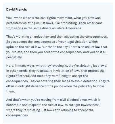 Next, check out this interview with David French, opinion columnist for the New York Times, who believes the student protestors are not within their rights to protest in the way they've been protesting. French says some Jewish students do not feel safe to move around on campus freely. NewsHour's Lisa DesJardins asks French to discuss what is actually problematic and unlawful conduct in light of the lunch counter sit-ins of the Civil Rights Movement.