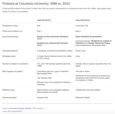 Protests that have taken place over the last few weeks on U.S. college campuses have raised comparisons to the Vietnam War campus protests. Specifically, New York's Columbia University's South Lawn protests by pro-Palestinian students have drawn comparisons to 1968 when police were also called to clear protesting students from campus. If time allows, listen to the 6-minute NPR story here.