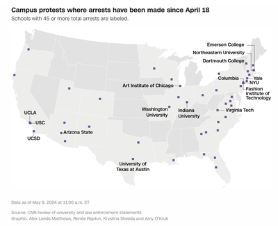 Courtesy: CNN. Data as of May 8, 2024 at 11:00 a.m. ET. Source: CNN review of university and law enforcement statements. Graphic: Alex Leeds Matthews, Renée Rigdon, Krystina Shveda and Amy O'Kruks.