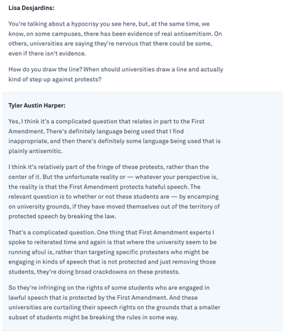 NewsHour interviewed Harper here. Read this excerpt below as it pertains to Constitution rights and if the students were within those rights by setting up encampments as well as the crackdown by law enforcement that has led to many arrests.