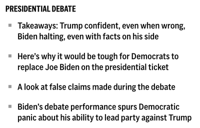 - New York Times's A Fumbling Performance and a Panicking Party: President Biden’s shaky, halting debate performance has Democrats talking about replacing him on the ticket
