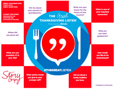 Students will use class time to learn the basics of StoryCorp's The Great Thanksgiving Listen project, including basic interviewing skills, feeling comfortable using the app and choosing the questions on the placemat that they will ask family members about over the holiday. Note: You can do this activity after Thanksgiving as well, or any time of the year for that matter!