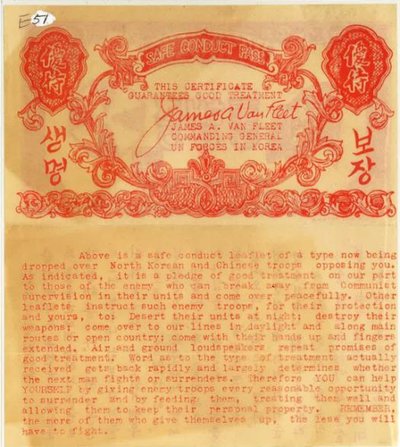 During the war, millions of propaganda leaflets were dropped over enemy lines in order to weaken enemy morale and encourage surrender (Korean War Propaganda Leaflet Collection at the Library of Congress).