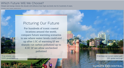 - Check out the Coastal Risk Screening Tool (if time allows, watch the tutorial) and choose a map that you'd like to explore further. Click year, water level, warming choices, etc. What parts of the world have coasts most under threat?