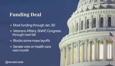 At over 40 days, the end of the longest shutdown in government history could be in sight. A group of Democrats and one independent crossed the aisle to make a deal with Republicans. It still needs approval from the Senate, House and president, but the government could reopen as soon as this week. Congressional correspondent Lisa Desjardins reports.