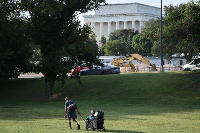 A man clears his belongings from a homeless encampment near the Lincoln Memorial August 14, 2025 in Washington, DC. Photo by Win McNamee/Getty Images