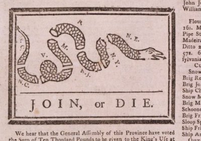 "The influential 'Join, or Die' cartoon first appeared in the May 9, 1754 issue of the Pennsylvania Gazette. It represented the British North American colonies as a severed snake cut into eight segments, with the New England region as its head. Benjamin Franklin published the cartoon along with an editorial urging colonial political unity in relation to conflict and negotiations with the French and the Haudenosaunee, or Iroquois Confederacy. ...The woodcut was widely reprinted. It became a popular iconic rallying cry for colonial unity leading into the American Revolution."