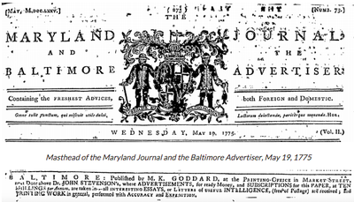 Maryland Journal and the Baltimore Advertiser, May 19, 1775. Edited to include both masthead on the top portion and publisher’s name on the bottom portion. Permission has been granted for educational purposes only by the New York Public Library.