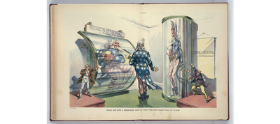 Keppler, Udo J., Artist. Uncle Sam gets a reassuring view of what the new tariff will do to him / Kep. , 1913. N.Y.: Published by Keppler & Schwarzmann, Puck Building. Photograph. https://www.loc.gov/item/2011649596/.