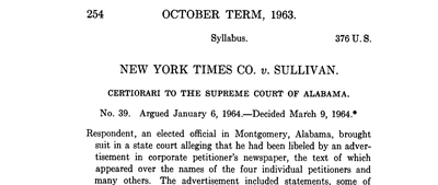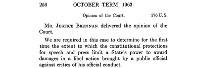 “We consider this case against the background of a profound national commitment to the principle that debate on public issues should be uninhibited, robust, and wide-open, and that it may well include vehement, caustic, and sometimes unpleasantly sharp attacks on government and public officials…Injury to official reputation affords no more warrant for repressing speech that would otherwise be free than does factual error.”