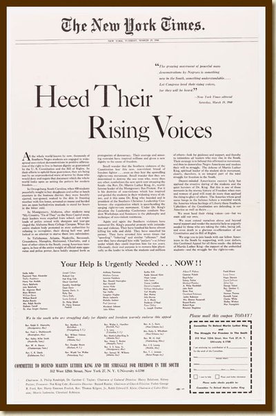 In 1960, the New York Times published a full-page ad titled “Heed Their Rising Voices” in which it condemned police action against the non-violent student civil rights protests, specifically focusing on events in Montgomery, Alabama.