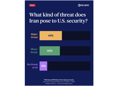 A plurality of Americans – 44% – say Iran is a major threat to U.S. security, according to the latest PBS News/NPR/Marist poll. Another 40% see the country as a minor threat, while 15% see it as no threat at all. Graphic by Dan Cooney/PBS News.